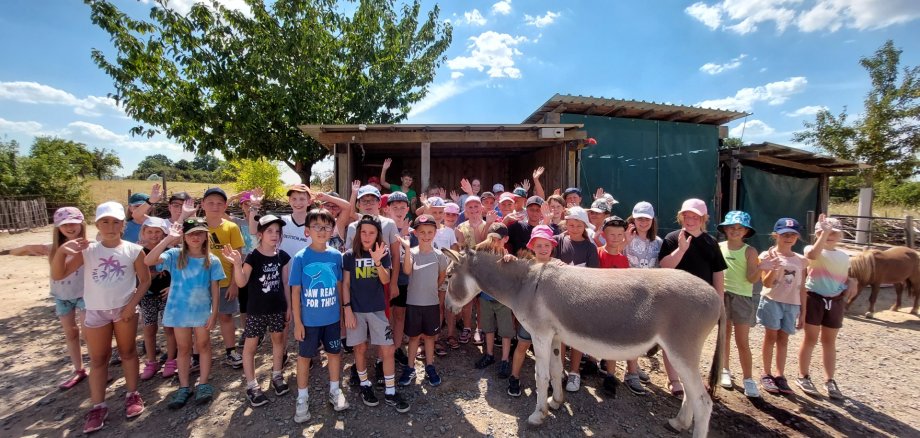 Am Donnerstag machten wir uns bei heißen 39 Grad mit dem Bus auf den Weg zum Erlebniszentrum Spessart in Eschau. Hier konnten die Kids an drei verschiedenen Stationen wieder das Thema Wasser näher kennenlernen. Zum einen lernten sie verschiedene Bauernhoftiere kennen und erfuhren wie viel diese z.B. im Vergleich zum Menschen am Tag trinken. Bei der zweiten Station ging es mehr um den Spaß: Hier traten die Kids in zwei Teams gegeneinander bei einem großen Parcours an. Gewinner war das Team, was unterwegs am wenigsten Wasser beim Transport verloren hatte. An der dritten Station ging es um Recycling: Hier stellten die Kids beim „Papierschöpfen“ aus alten zerrissenen Zeitungsstücken und Wasser neues Papier her.