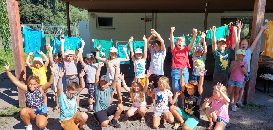 Ausgestattet mit eigenen T-Shirts, aus denen Farbwunder entstehen sollten, kamen die 20 teilnehmenden Kinder zum Röhricheck. Ganz kreativ wurde dann gleich mit dem Batiken gestartet. Geknotet oder mit Gummiringen abgeschnürt tauchten sie gleich die Shirts in die Batikfarbe. Die Kinder kamen aus dem Staunen nicht mehr heraus, denn es zeigten sich die tollsten Farbwunder. Gut, dass das Team der Jugendförderung Turnbeutel besorgt hatte, die auch in die Farbeimer getaucht werden konnten. Der Farb-Spaß garantierte somit bleibende Erinnerungen. Nach dem Mittagessen, zu dem die Kindergruppe sich auf der Sonnenterrasse des Freibades traf und genüsslich Würstchen, Pommes und Eis verspeiste, stand die große Zauberschau mit dem Zauberer Abraxas auf dem Programm. Zunächst schworen sie den Ehrenkodex der Zauberer, alles geheim zu halten, was sie gleich beigebracht bekamen. Sie lernten tolle Karten- und Bierdeckeltricks, übten Zauberknoten an Seilen, staunten über so manche optische Täuschung mit einem Glitzerzauberstab und bekamen sogar ein Heft mit Zaubertricks geschenkt. Gut, dass Sie morgens einen Turnbeutel gebatikt hatten, der sofort zum Zauberbeutel umfunktioniert wurde und in dem nun alle Utensilien – natürlich streng geheim vor den Eltern – verstaut und versteckt wurden. Stolz präsentierten sie den Eltern beim Abholen ihre Batikteile und den Zauberbeutel.