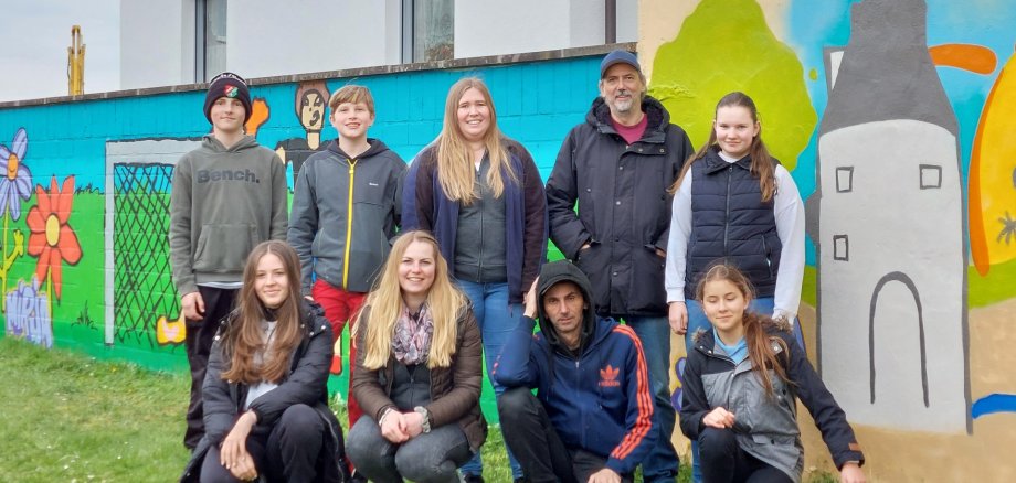 Drei Mädels und 2 Jungs nutzten beim Graffiti- Jugendtagworkshop in Radheim die Gelegenheit das Sprayen kennenzulernen und ganz legal die Mauer am Spielplatz in der Ringstraße im Ortsteil Radheim mit den beiden professionellen Sprayern Ralf und Arnd zu besprühen.
