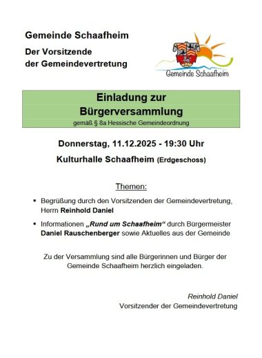 Einladung zur Bürgerversammlung der Gemeinde Schaafheim am Donnerstag, 11.12.2025