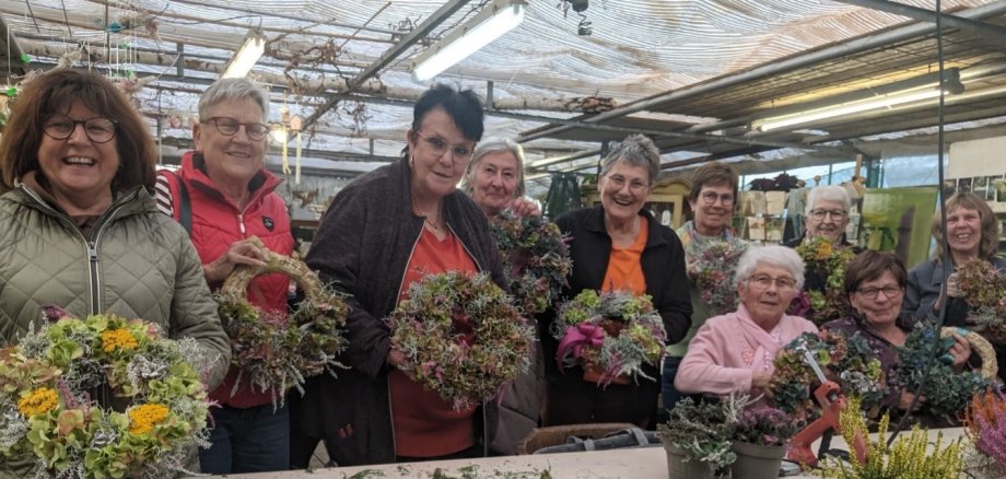 Stolz präsentieren die Ruheständlerinnen ihre liebevoll gestalteten Wintergestecke – ein gelungener Workshop voller Herzlichkeit und Gemeinschaft.