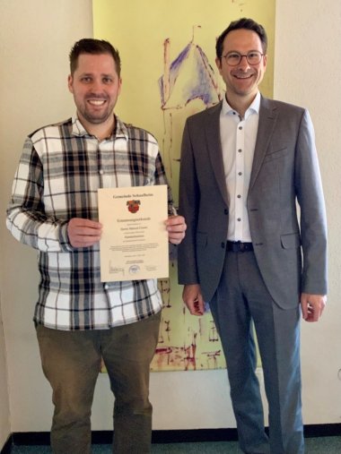 Bürgermeister Daniel Rauschenberger hat Marcel Creutz offiziell die Ernennungsurkunde zum Standesbeamten überreicht. Marcel Creutz ist bereits seit einiger Zeit im Rathaus tätig, vor allem im Ordnungsamt und steht nun auch für Trauungen zur Verfügung.