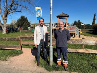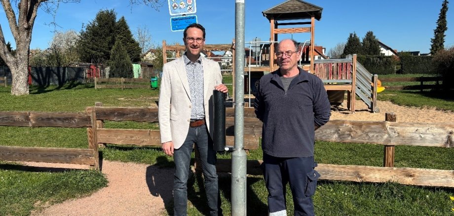 Bgm. Rauschenberger und Bauhof-Mitarbeiter Erhard Schröder vor dem Aschenbecher, der an der Laterne vor dem Spielplatz angebracht wurde.